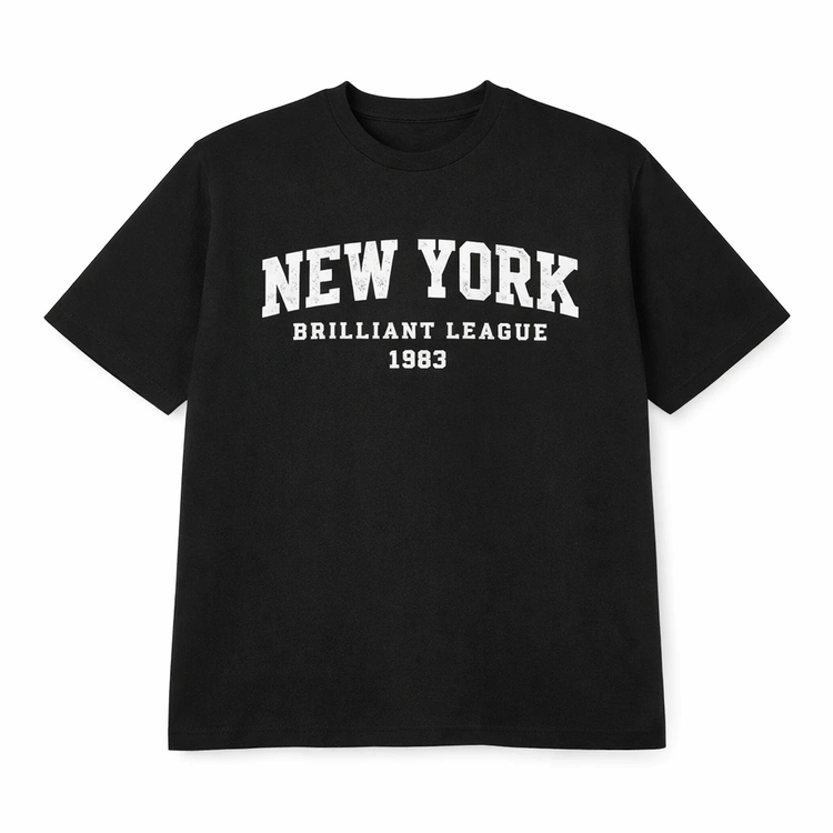 چاپ نوشته NEW YORK – Brilliant League 1983 جلوهای ترندی و همیشهمد دارد و بهراحتی با شلوار جین، لگ یا اسلش ست میشود.