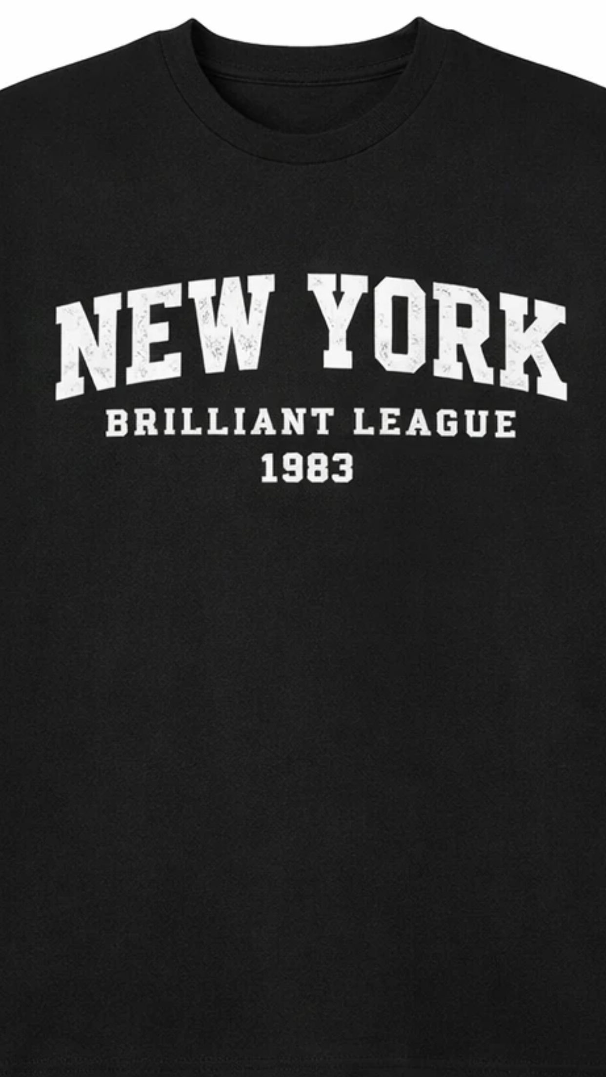 چاپ نوشته NEW YORK – Brilliant League 1983 جلوهای ترندی و همیشهمد دارد و بهراحتی با شلوار جین، لگ یا اسلش ست میشود.