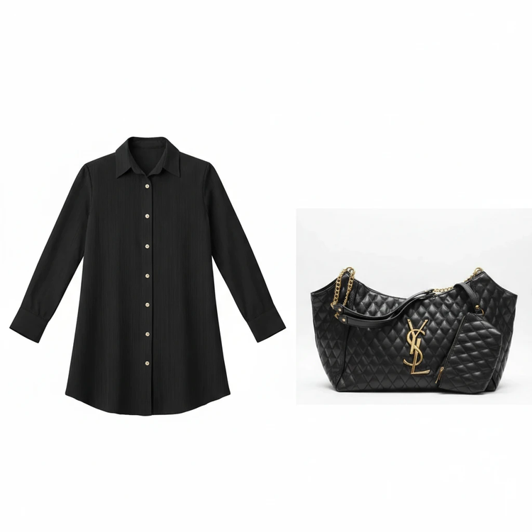 در کنار این شومیز، کیف YSL مشکی با طراحی شیک و لاکچری قرار دارد که جلوه استایل شما را کامل میکند.